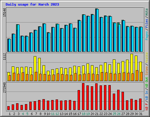 | Day | Hits | Files | Pages | Visits | Sites | kB F | kB In | kB Out | ||||||||